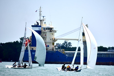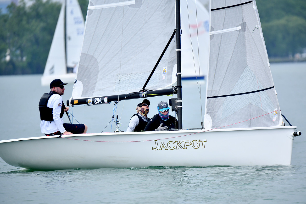 We shared a circle with the J70’s sailing right in front of the club on the Detroit River. The persistent 3 kt current posed a challenge for RC and sailors alike in the very light conditions that prevailed on Saturday, limiting us to one race as a storm system chased us back to the club early in the afternoon.