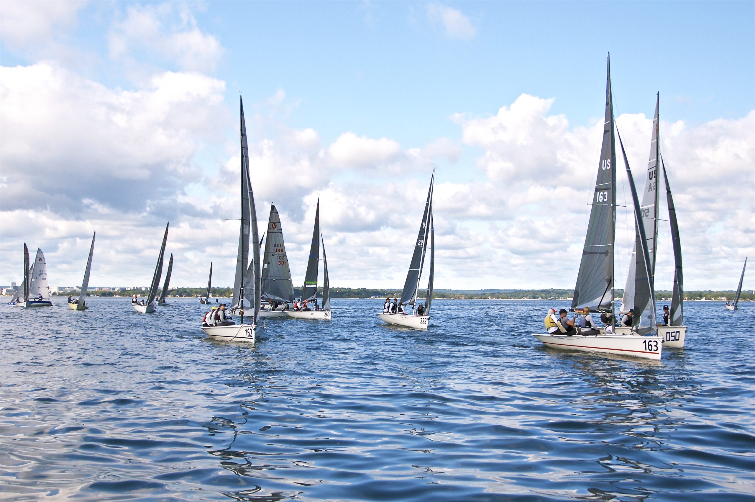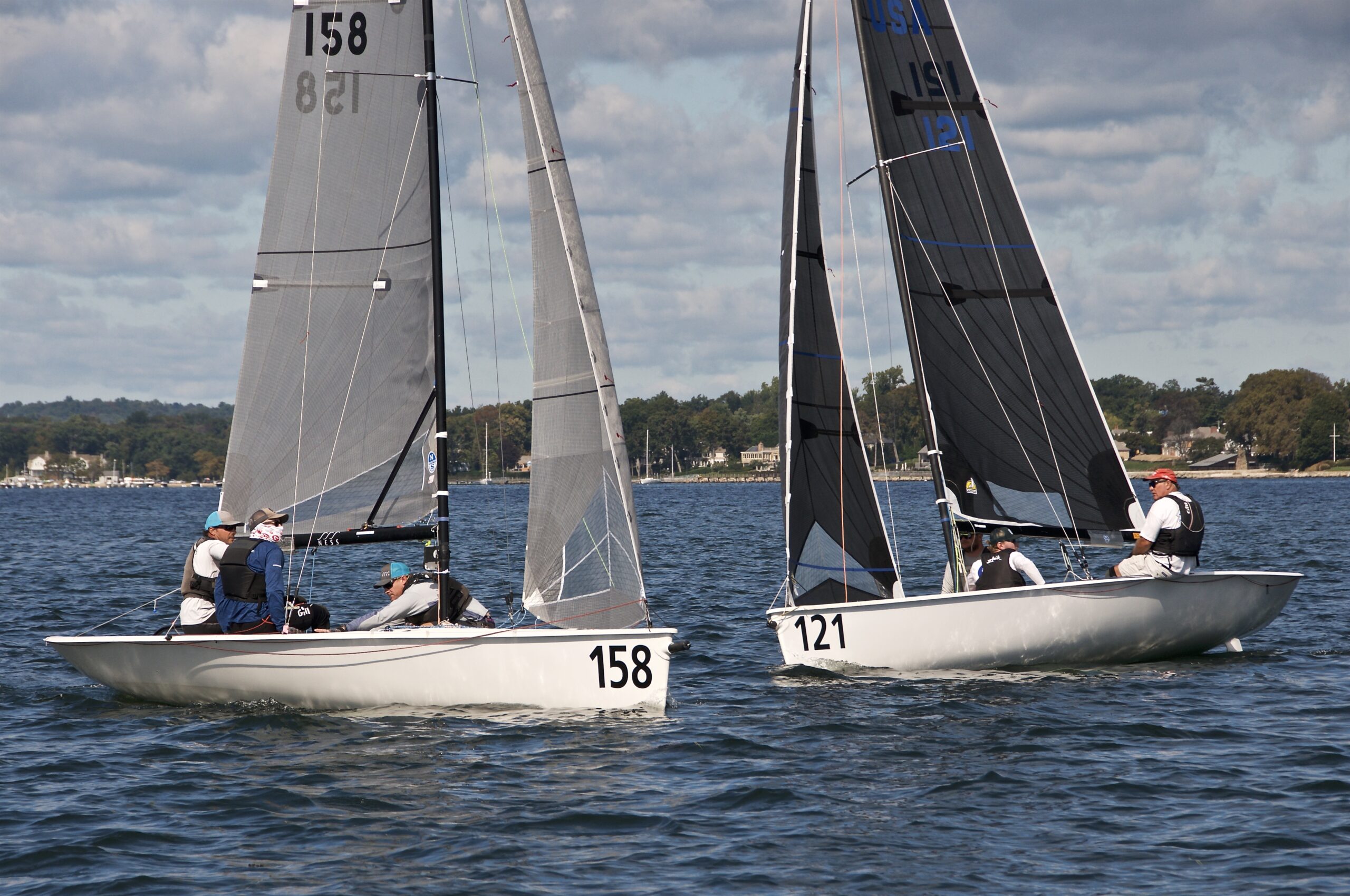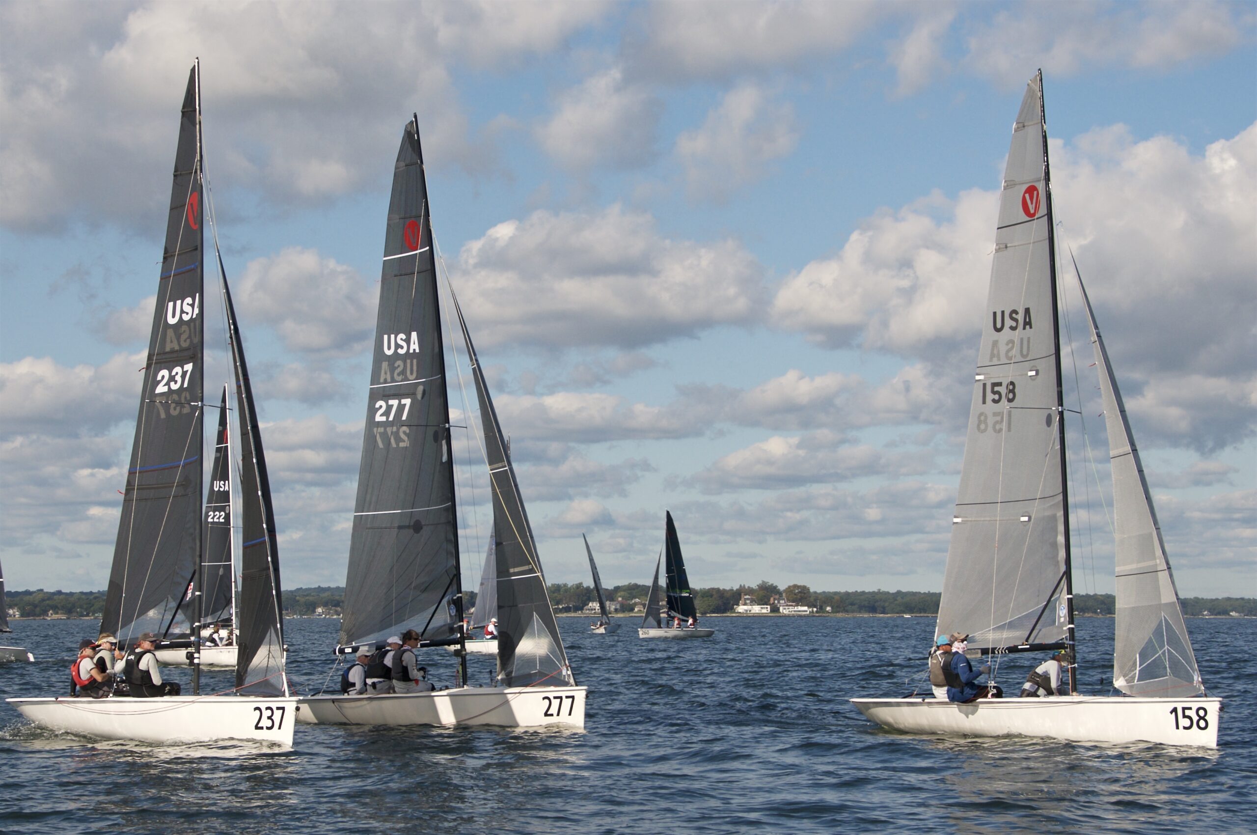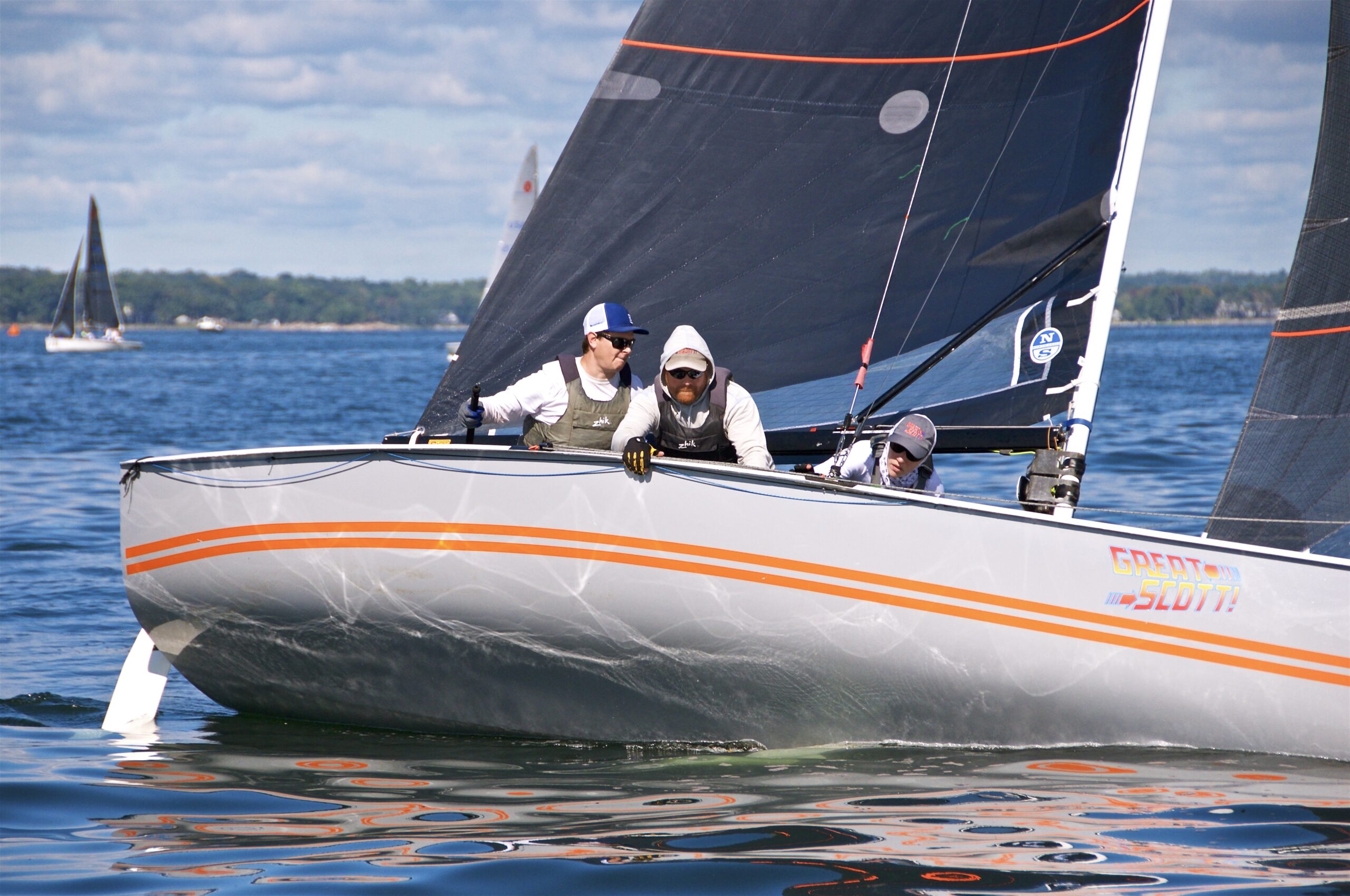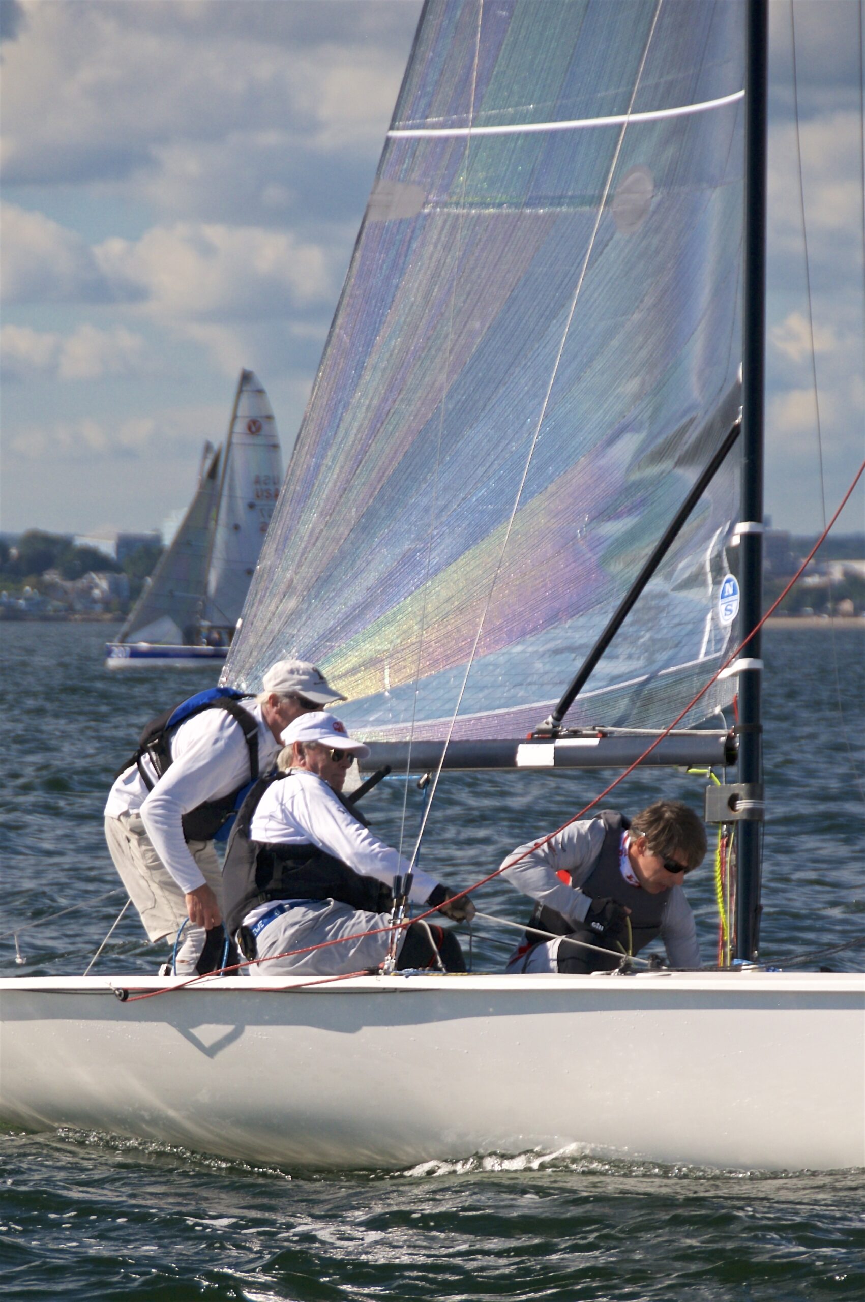 “The key today, was to get off the line cleanly and connect the dots of breeze,” said Jay Rhame sailing with his boat partners Peter and Rachel Beardsley in GREAT SCOTT! “In the first race, we were boat-third at the start and tacked out to the right early. We found that there was more pressure to the right and less ebb tide and we were there first. We put our bow down and just sailed as if it was a drag race.” Rhame and the Beardsleys lead the day after three races with a 1-5-2 line score for eight points. Just one point back is Mark Zagol with 10 points, who is sailing with Tim Desmond and Drew Buttner. After a pair of fourth-place finishes, Zagol won the third race by two boatlengths over Great Scott! after late gybing duel.