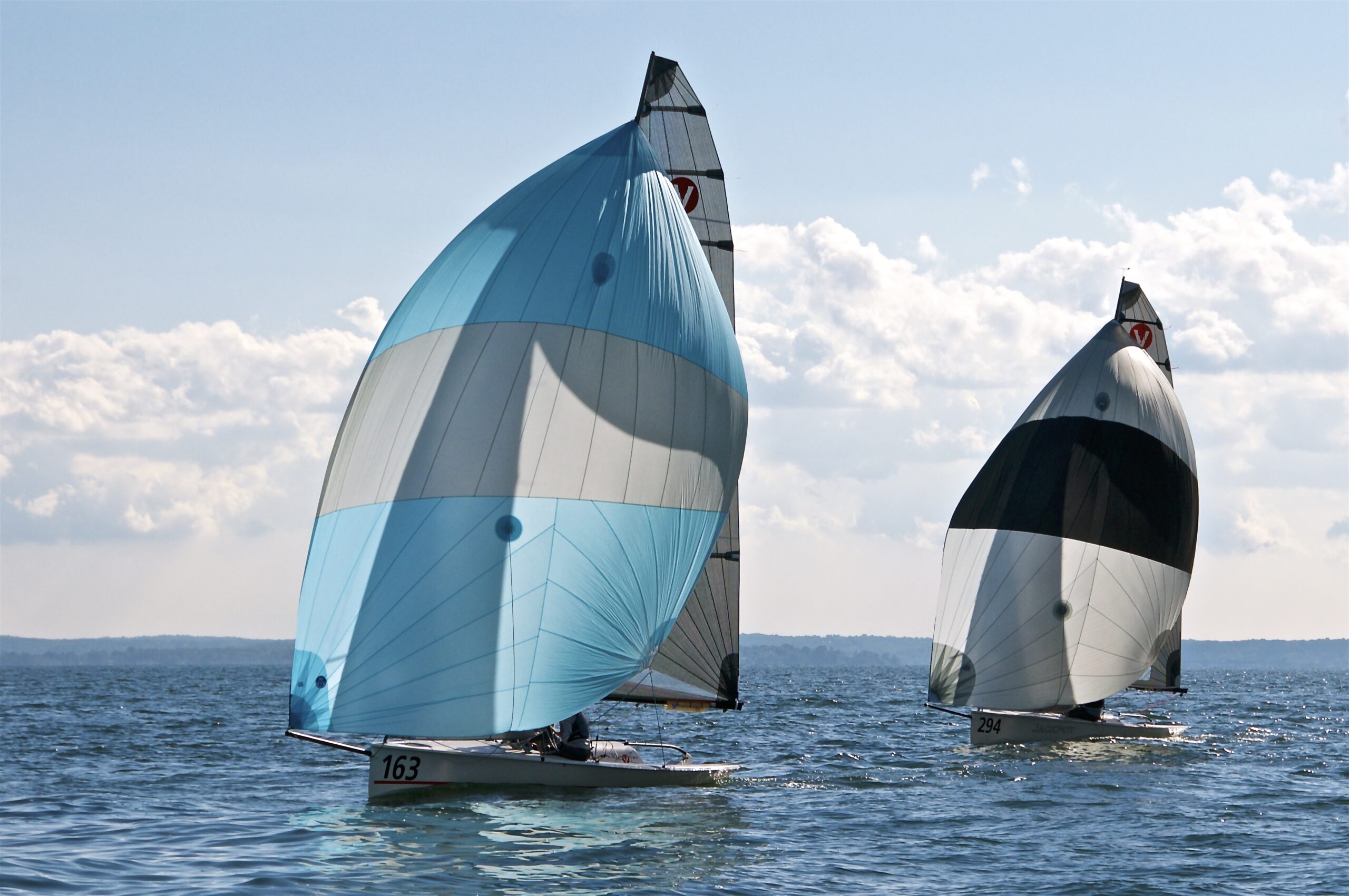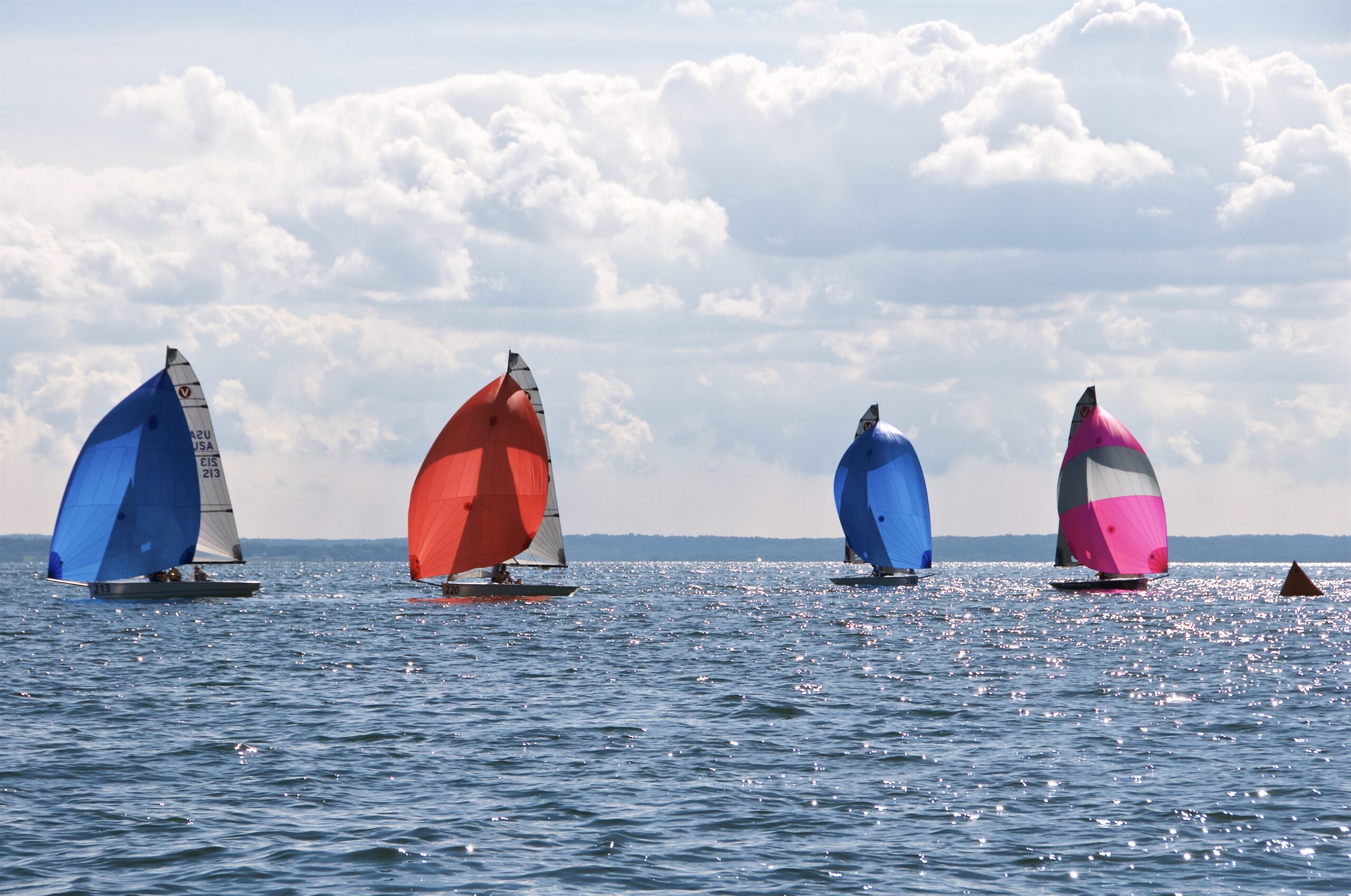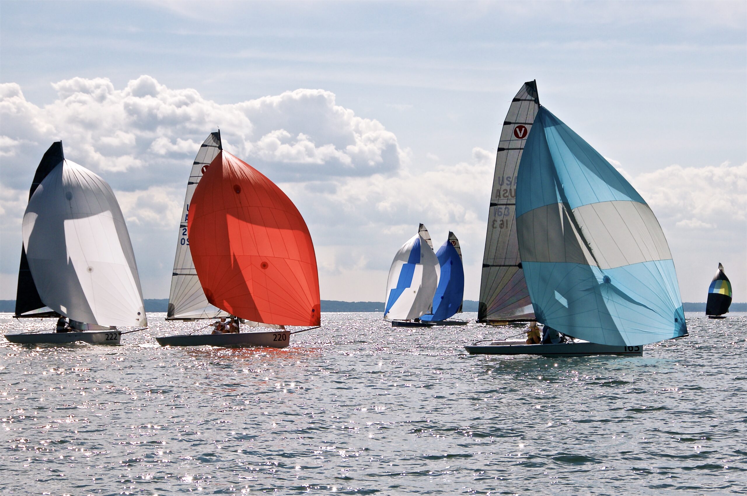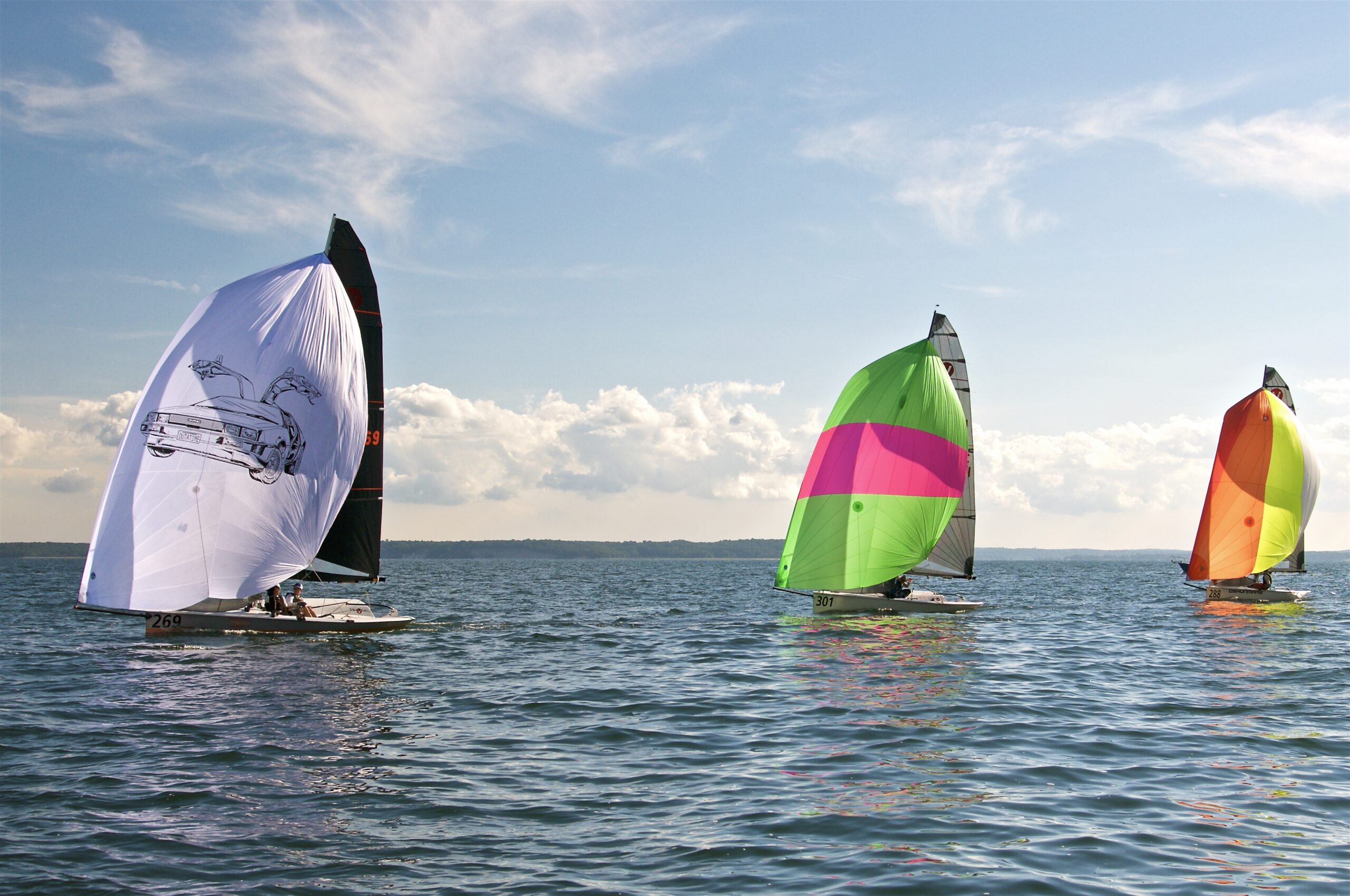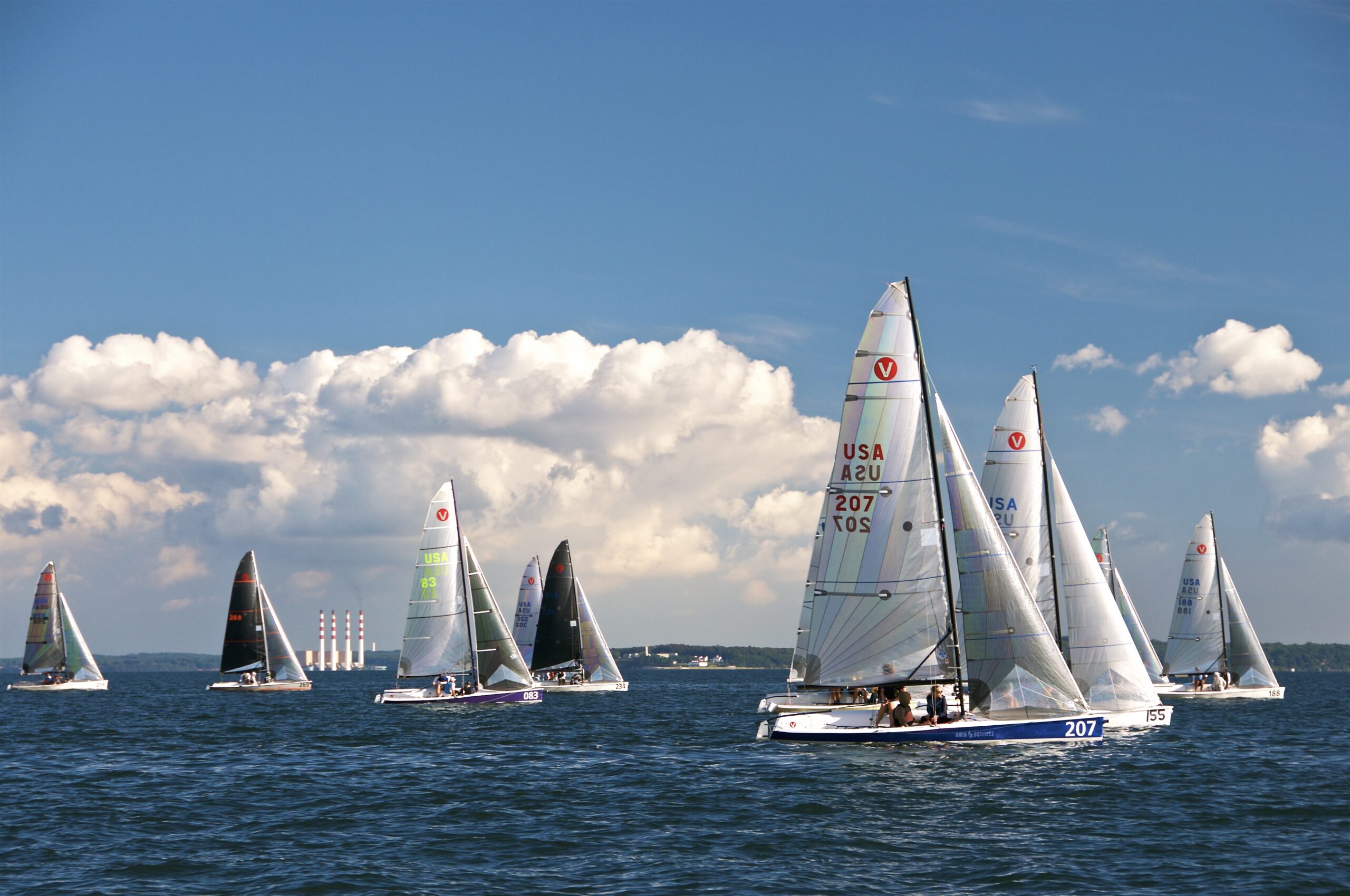 “The key today, was to get off the line cleanly and connect the dots of breeze,” said Jay Rhame sailing with his boat partners Peter and Rachel Beardsley in GREAT SCOTT! “In the first race, we were boat-third at the start and tacked out to the right early. We found that there was more pressure to the right and less ebb tide and we were there first. We put our bow down and just sailed as if it was a drag race.” Rhame and the Beardsleys lead the day after three races with a 1-5-2 line score for eight points. Just one point back is Mark Zagol with 10 points, who is sailing with Tim Desmond and Drew Buttner. After a pair of fourth-place finishes, Zagol won the third race by two boatlengths over Great Scott! after late gybing duel.